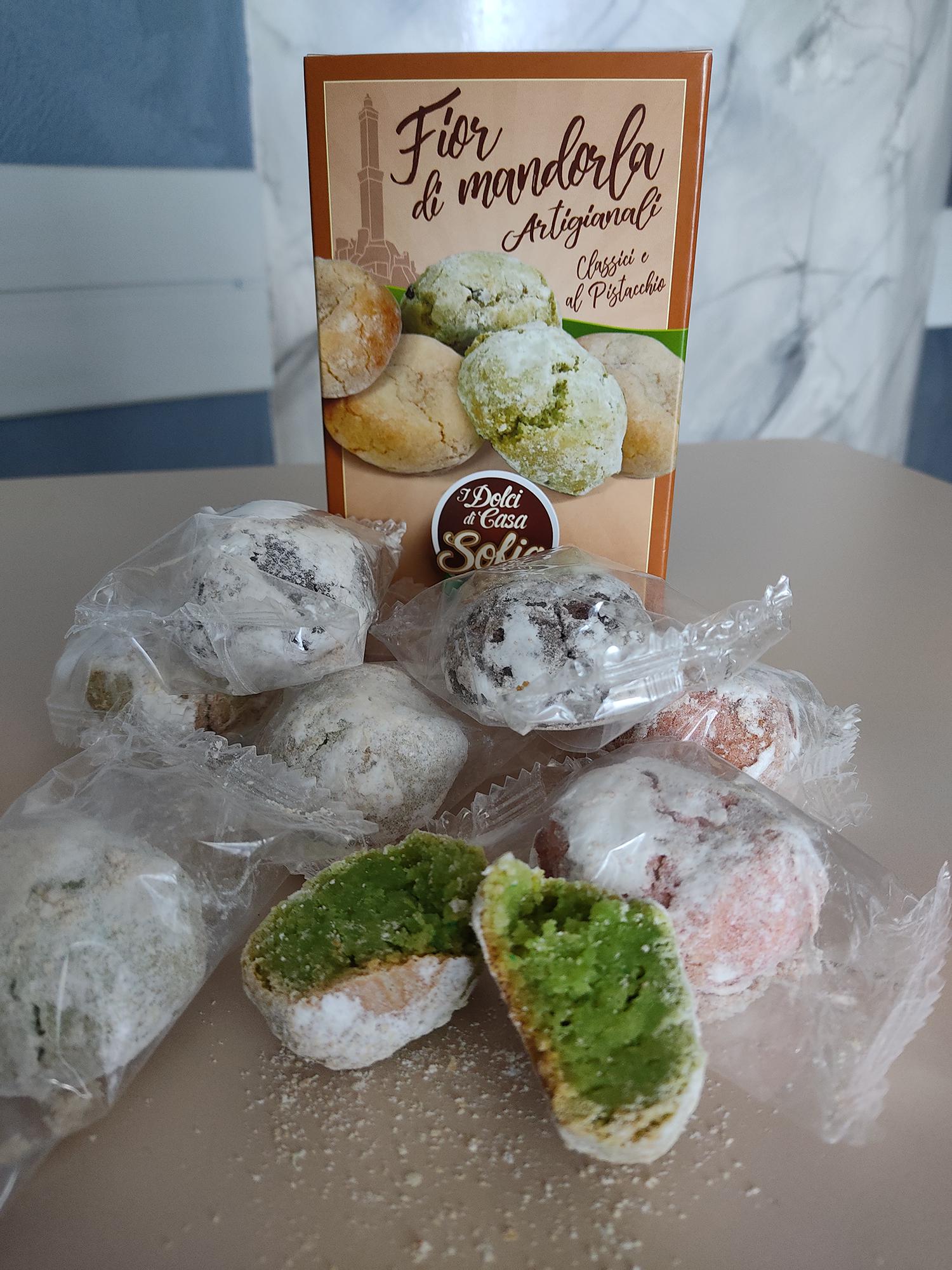 Biscotti fior di mandorla assortiti classici e al pistacchio.